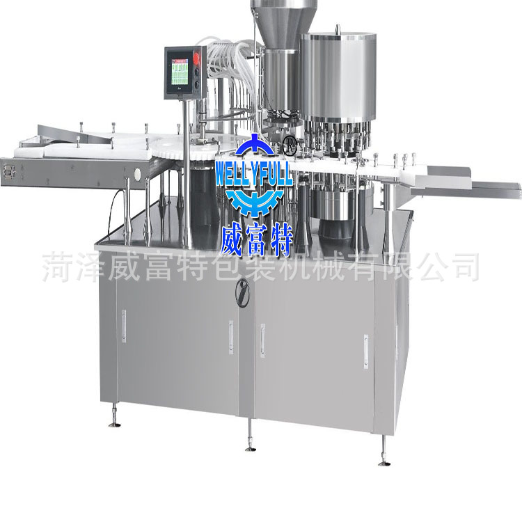 整機(jī)能自動(dòng)進(jìn)瓶、跟蹤灌裝、自動(dòng)送蓋上蓋和旋蓋或軋蓋,全部工序一機(jī)完成,可節(jié)省占地面積,自動(dòng)化程度高。該機(jī)具有無瓶不灌、不上蓋、變頻器無級(jí)調(diào)速等功能,工作臺(tái)邊45°C底易清洗槽。
