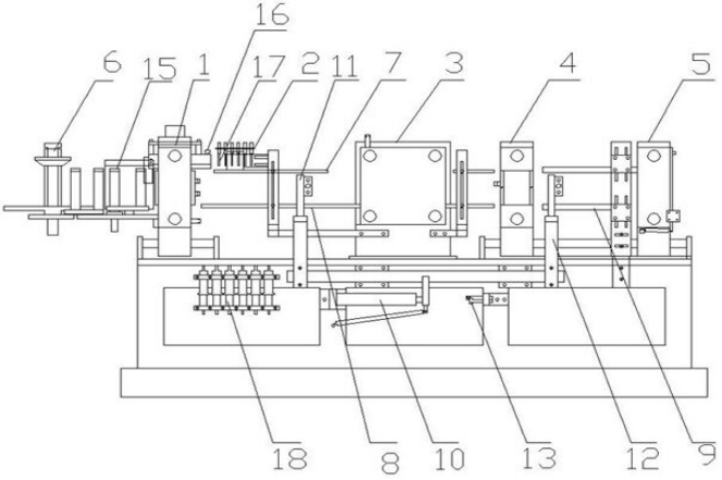 2.3.1所述送料裝置包括有放料輥6、上軌道7、下軌道8、后軌道9、推送氣缸10、前牽引機(jī)構(gòu)11和后牽引機(jī)構(gòu)12,所述前牽引機(jī)構(gòu)11設(shè)置在上、下軌道8上,后牽引機(jī)構(gòu)12設(shè)置在后軌道9上,前牽引機(jī)構(gòu)11和后牽引機(jī)構(gòu)12均通過(guò)連桿由推送氣缸10傳動(dòng)進(jìn)行牽引,且前牽引機(jī)構(gòu)11和后牽引機(jī)構(gòu)12的牽引路徑終端分別設(shè)置有前牽引定位器和后牽引定位器。送料裝置實(shí)現(xiàn)兩張平行且相對(duì)的模材料在軌道上由牽引機(jī)構(gòu)進(jìn)行傳遞。